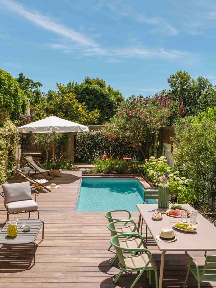 Ce jardin bordelais, attenant à une élégante maison traditionnelle, a été aménagé avec soin pour offrir un cadre à la fois fonctionnel et esthétique, mettant en valeur la piscine unique de la propriété. Cette dernière, dotée d'une terrasse mobile en bois exotique (itauba), s'ouvre et se ferme selon les besoins, créant ainsi un espace modulable et pratique. Autour de la piscine, nous avons agencé des zones de détente et de convivialité, parfaites pour profiter des beaux jours.